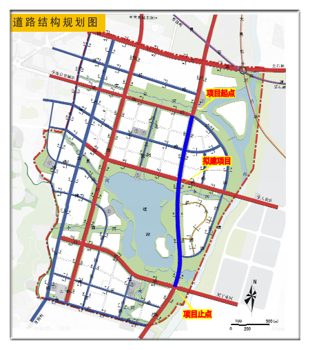 線路走向:道路線形走向為南北向,起于請遠(yuǎn)街與經(jīng)五路交叉口處,南止于經(jīng)三路南段與緯四路交叉口處,全長2276.21m。