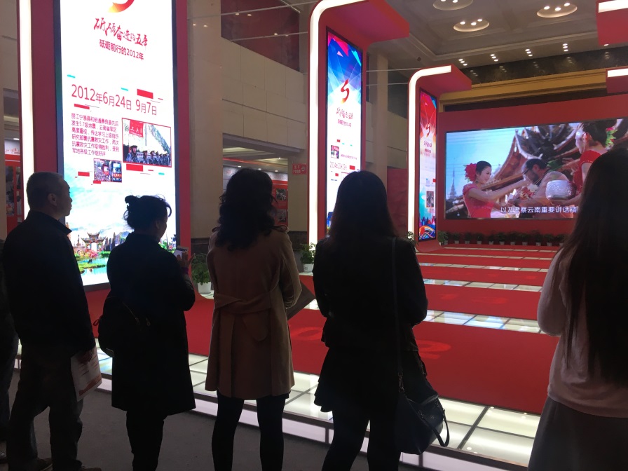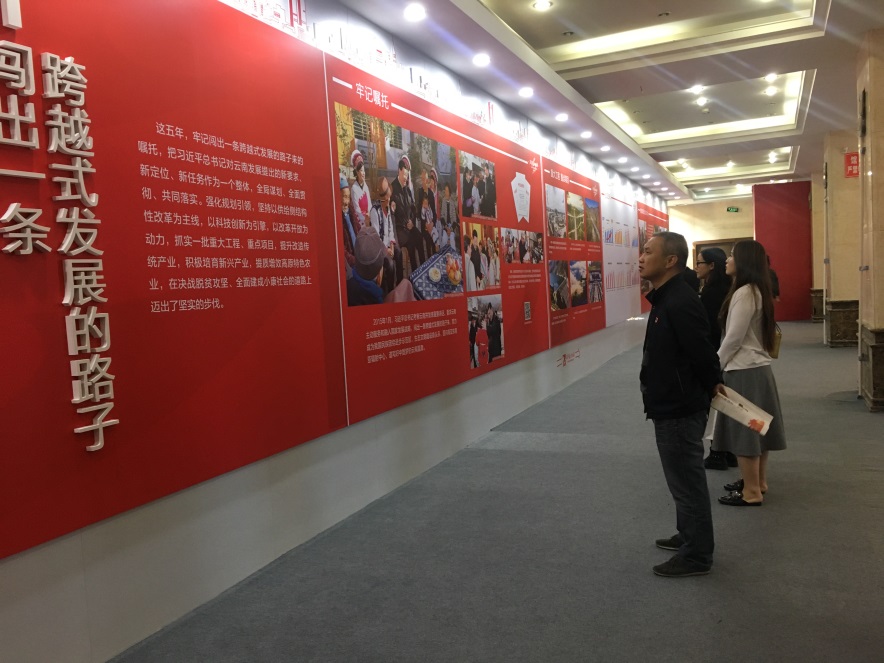 展覽分為闖出一條跨越式發展的路子、民族團結進步示范區、生態文明建設排頭兵、面向東南亞輻射中心、不忘初心繼續前進等五個部分。展示了黨的十八大以來,省委、省政府團結帶領全省各族人民深入學習貫徹習近平總書記系列講話精神和治國理政新理念、新思想、新戰略以及考察云南重要講話精神的實際行動。展示了云南社會經濟發展的輝煌成就、各族群眾生活的新變化,以及省委從嚴治黨取得的成效。統籌推進“五位一體”總體布局和協調推進“四個全面”戰略布局,堅持以新理念引領經濟發展新常態,堅持發展第一要務和全面從嚴治黨主體責任兩手抓、兩手都要硬,全省經濟社會和黨的建設等各項工作都取得了新成效、發生了新變化,在決戰脫貧攻堅、推動跨越發展,全面建設小康社會的道路上邁出了堅實的步伐。