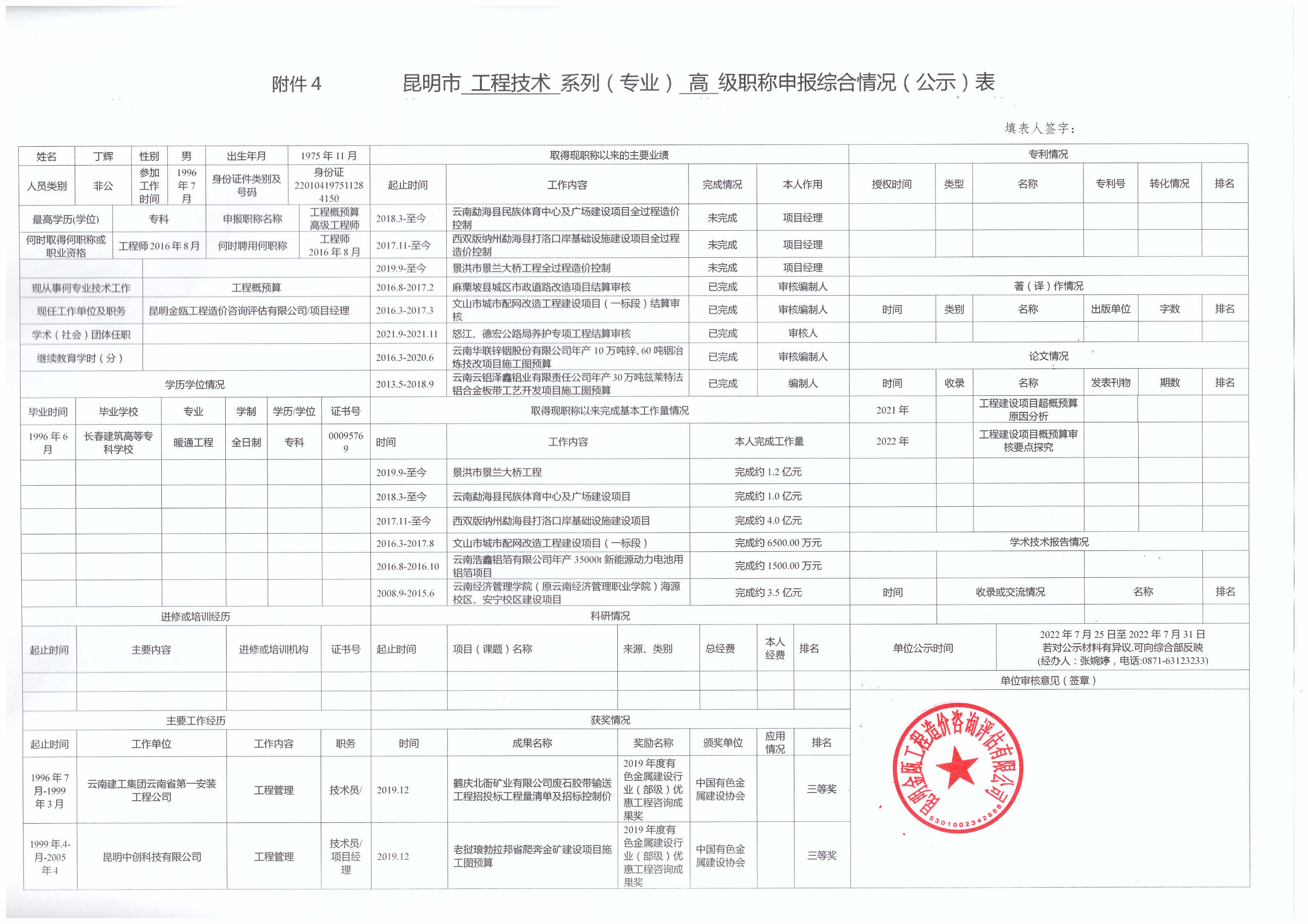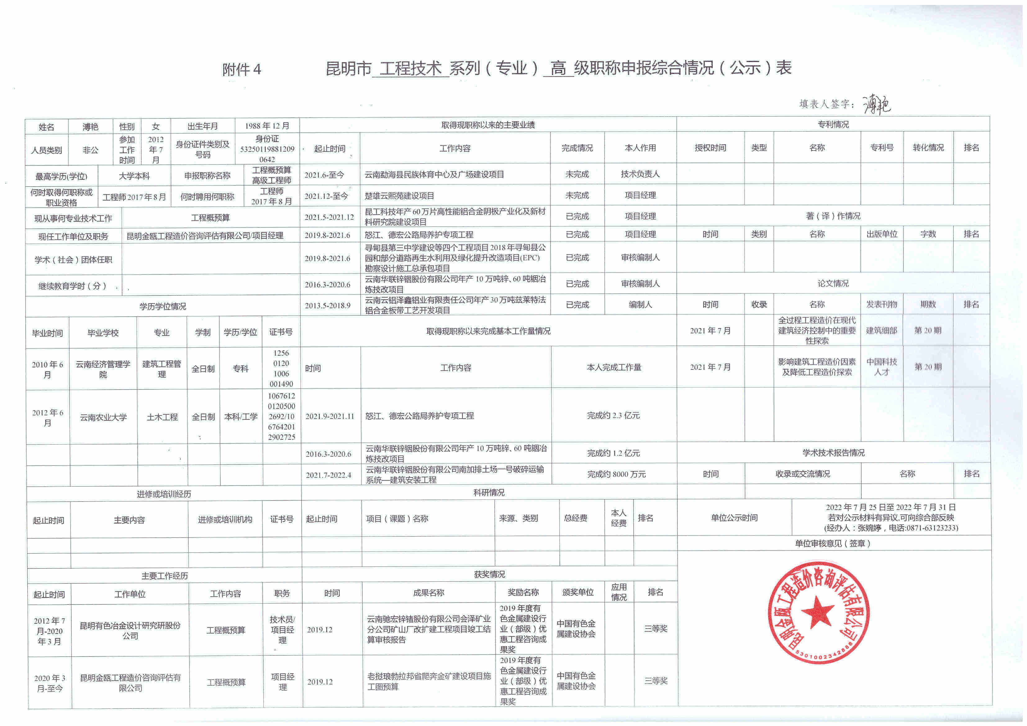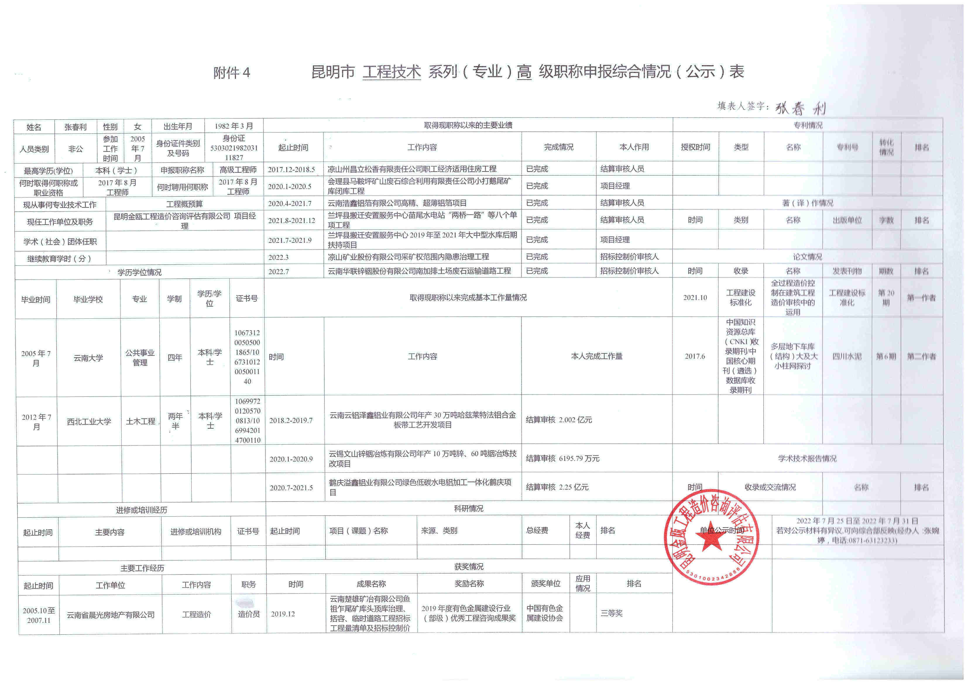 根據(jù)《云南省職稱評(píng)審管理實(shí)施辦法(試行)》(云人社發(fā)〔2020〕57號(hào))、《關(guān)于開(kāi)展2022年專業(yè)技術(shù)職稱申報(bào)評(píng)審工作的通知》(昆人社通〔2022〕54號(hào))和昆明市住房和城鄉(xiāng)建設(shè)局《關(guān)于做好2022年昆明市建筑工程初中高級(jí)職稱申報(bào)評(píng)審工作的通知》(昆建通〔2022〕169號(hào))的相關(guān)要求,公司以下人員擬參加2022年建筑工程高級(jí)職稱申報(bào),現(xiàn)將申報(bào)人的《昆明市職稱申報(bào)綜合情況(公示)表》進(jìn)行公示,若對(duì)公示材料有異議,可向綜合部反映(經(jīng)辦人:張婉婷,電話:0871-63123233) 。