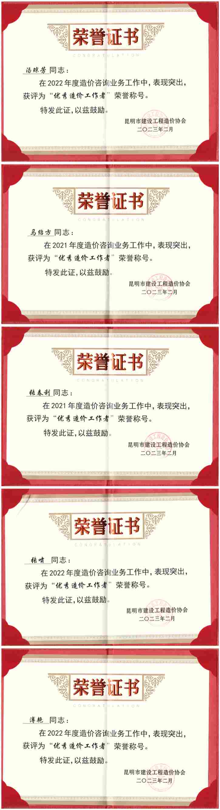 我司優秀員工湯瓊芳、馬紹方、張春利、張嘯、溥艷在2021~2022年造價咨詢業務工作中表現突出,榮獲“優秀造價工作者”榮譽稱號。